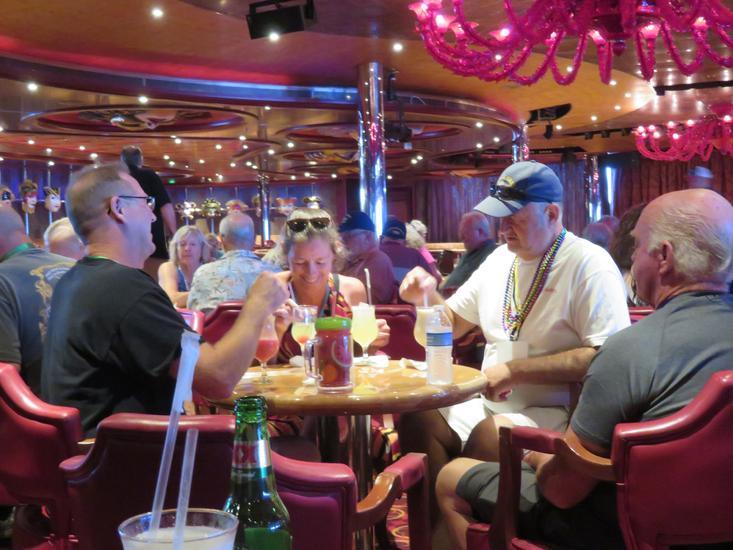 After the 2017 ‘Land’ reunion closed, it was time to begin the 2017 ‘Cruise’ reunion. Two charter bus trips were required to take the more than 100 shipmates/guests from the ‘Land’ reunion hotel to the cruise terminal on the Mississippi River. The first trip departed the hotel at 1200 and the final trip departed the hotel at 1330. After loading more than 3000 cruisers, the ship got underway from New Orleans at 1600 and headed down the Mississippi towards the Gulf for the start of a seven-day cruise. The USS Grant ‘Cruise’ Reunion group was the single largest group on the cruise ship.